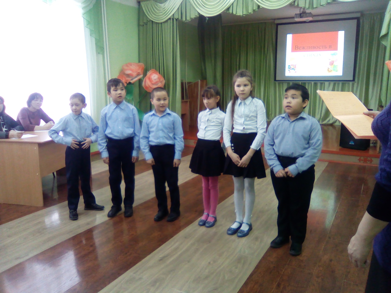 Дети закрепили свои знания о вежливости, просмотрели видеоролик «Давайте говорить друг другу комплименты», играли в игры «Пять шагов к счастью», «Кто любит шоколад?». Своим ярким выступлением очаровала всех Апсадыева Аделина из 2 класса. Серьезно подготовились Хайруллин Евгений из 3 класса и ребята из 5а класса, которые показали инсценировку стихотворения «В гостях веди себя правильно».